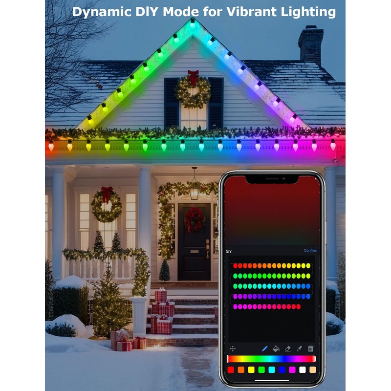 DIY Xmas Lights via Bluetooth APP: Programmable the lights' color, dynamic or static modes, speed and brightness by individually addressable to make your favorite lights animation. Outdoor Christmas lights also has many preset scene modes, music sync, 16 million colors, 1-100% dimmable and timer & countdown.