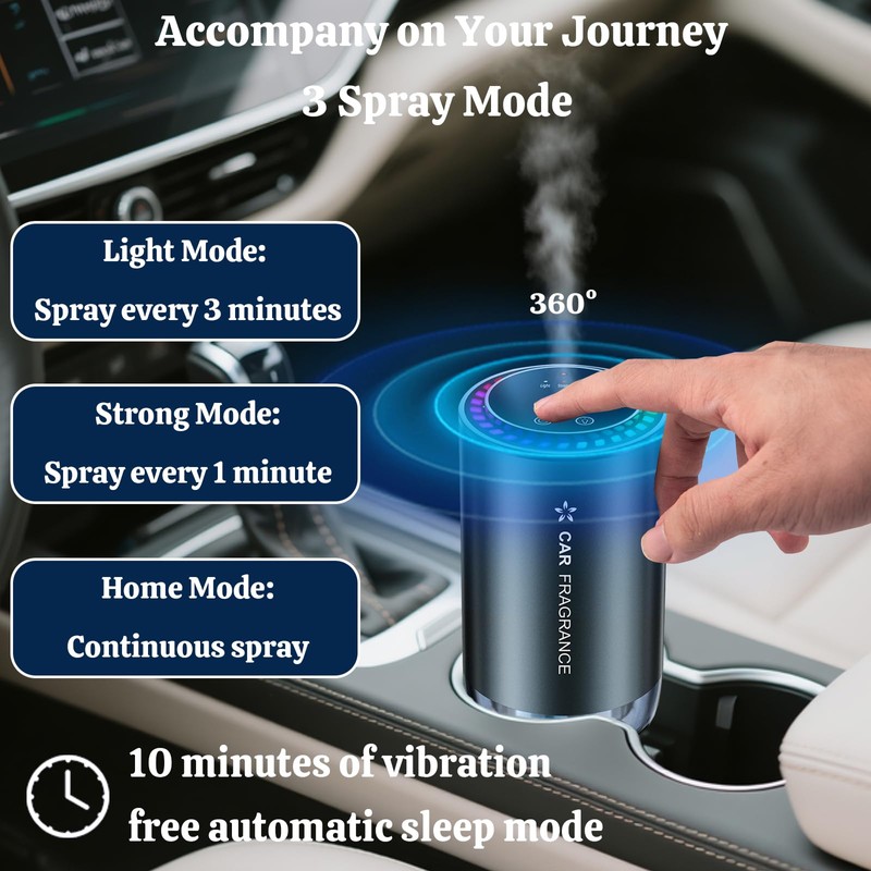 - 3 Adjustable Mist Modes: Our smart car aroma diffuser uses nano spray technology to silently spread fragrance to every corner of your car while neutralizing odors. Choose from 3 modes: Light, Strong, or Home mode for a personalized experience.