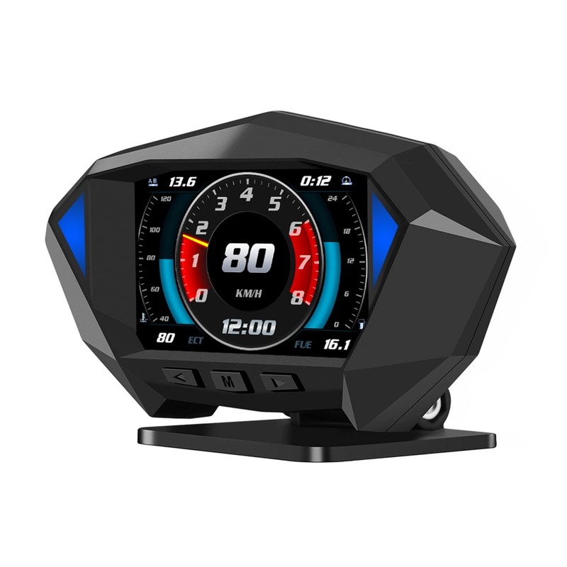 - [Multi-mode dual System: OBD, GPS, In clinometer. Display Speed, Voltage, Water temperature, Fuel consumption, Clock, Driving time, Driving direction, Latitude and longitude,Average fuel consumption, PID data, Acceleration test, Brake test, Roll angle