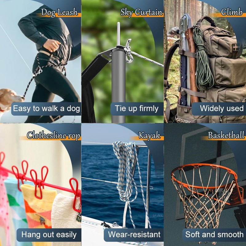 - 【widely used】The multi-purpose rope is strong, durable, and lightweight, and it still performs well in various harsh environments, so it is widely used both indoors and outdoors, such as in crafting, nautical, boating, fishing and camping.