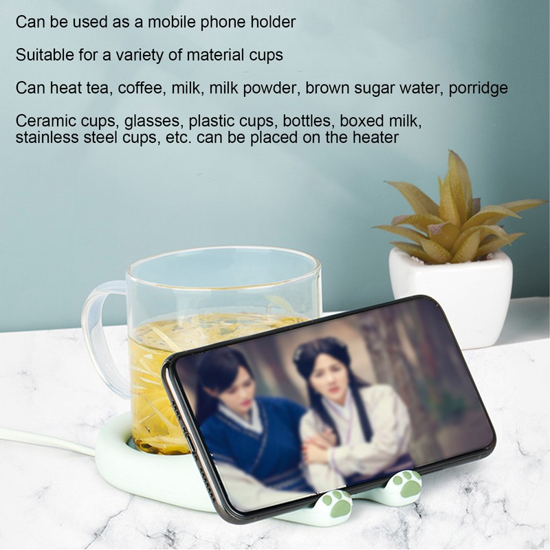 1、Adjustable Temperature: The product has three temperature modes, each button pressed to adjust to the next temperature mode, the three temperature modes are 45°C/113°F, 55°C/131°F or 70°C/158°F. 2、Auto Shut Off: The coffee cup heater will automatically turn off after 8 hours and you never have to worry about forgetting to turn off the coffee cup heater again. 3、Fits Flat Cups: This coffee cup warmer can use most flat bottom containers on it, such as ceramic cups, glasses, boxed milk and other flat bottom containers, flat bottom containers can get better heating results. 4、Safe and Convenient: This coffee cup heater is made of high‑tech materials, making the heater heat‑resistant and fire‑resistant, the silicone shell is anti‑scalding and non‑slip, which is very suitable for use in the home. 5、Good Choice for Gift Giving: This coffee cup warmer has practical features to keep the drink warm throughout the day, as well as a beautiful, cute shape, which is the best gifts choice for friends or family.