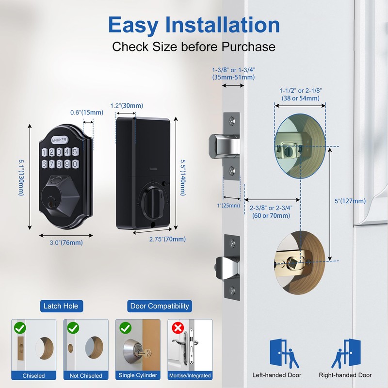 • Easy Installation: The door handle lock fits most US standard left-handed and right-handed doors, which can be easily installed with no drilling. Any gate door lock can be installed outdoors with water-proof, cold-proof, high-temperature protection (-25℃ to 70℃).ENOKER offers at least 1-year product warranty and customer support from the date of purchase, 24/7 email support for you.