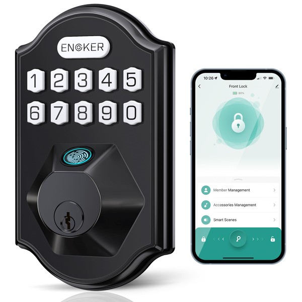• 5 Multiple Ways To Unlock: Fingerprint + Passcode + APP Control+Temporary Code+Physical Keys (2 PCS). The deadbolt door lock supports sharing with 200 users,100 fingerprints, and 100 group pin codes. ENOKER smart door lock will provide more options for you to unlock & lock your door more easily and safely. Let’s make your life more convenient and secure without keys.