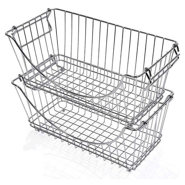 **Smart Design Kitchen Stacking Baskets [Chrome]** Made for organizing and stacking, the Smart Design Kitchen Stacking Baskets are perfect for organizing your family’s fruits and vegetables or canned food items for the pantry or shelves! With the easy-to-carry handles, you can maximize storage space and make traveling a breeze with these stacking baskets. **Package Includes** Set of 2 Steel Baskets with Handles. The sturdy steel design holds up to 10 lbs. safely and allows you to place alongside cabinets, shelves, and compact areas for even more space saving room. For Fruits and Vegetable, Food Items, Cans, and More. **Features and Benefits** Design made to stack for kitchen, bathroom, shelves, and pantry storage. Handles are perfect for traveling and space saving organization. **Product Specifications** Dimensions: 12.6(L) x 6.25(W) x 5.5(H) inches Size: Medium Weight: 1.63 lbs. Holds: Up to 10 lbs. Color: Chrome Material: Steel Metal Frame **Brand and Warranty Info** People around the world live smarter with Smart Design, manufacturers of innovative, high-quality home and commercial organizational and laundry care products. Since 1970, Smart Design has set the standard of excellence in the Home Organization Industry by developing products that allow consumers to optimize their needs. Everything from your closet, kitchen, laundry room, home office, garage and auto to your workplace. Located in Southern California, Smart Design is a family-owned company with customer service at the core of our business. If you have any questions, issues, or concerns about your order, reach out to our Customer Service Team via email anytime, 24/7. Our Team will do their best to respond to all emails within 24 hours. Visit us online for phone support Monday-Friday 8 am – 5 pm PST.
