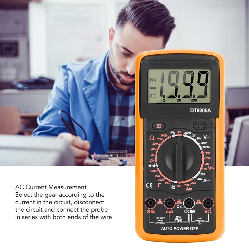 1、FOR HOME USE: The digital multimeter has a variety of detection functions and is compact, commonly used for home circuit detection. 2、WITH SUPPORT: The back of the multimeter has a retractable support, with 90 degree adjustment, which is convenient for standing operation. 3、GOOD PROTECTION: The groove design and anti falling silicone material of the multimeter effectively protect the hardware from damage. 4、POWER SAVING MODE: When the multimeter is not used for 10 minutes under low power mode, it will automatically shut down to save energy. 5、EASY OPERATION: The multifunction meter adopts LCD screen to display values clearly, and uses knob to adjust, which is easy to operate.