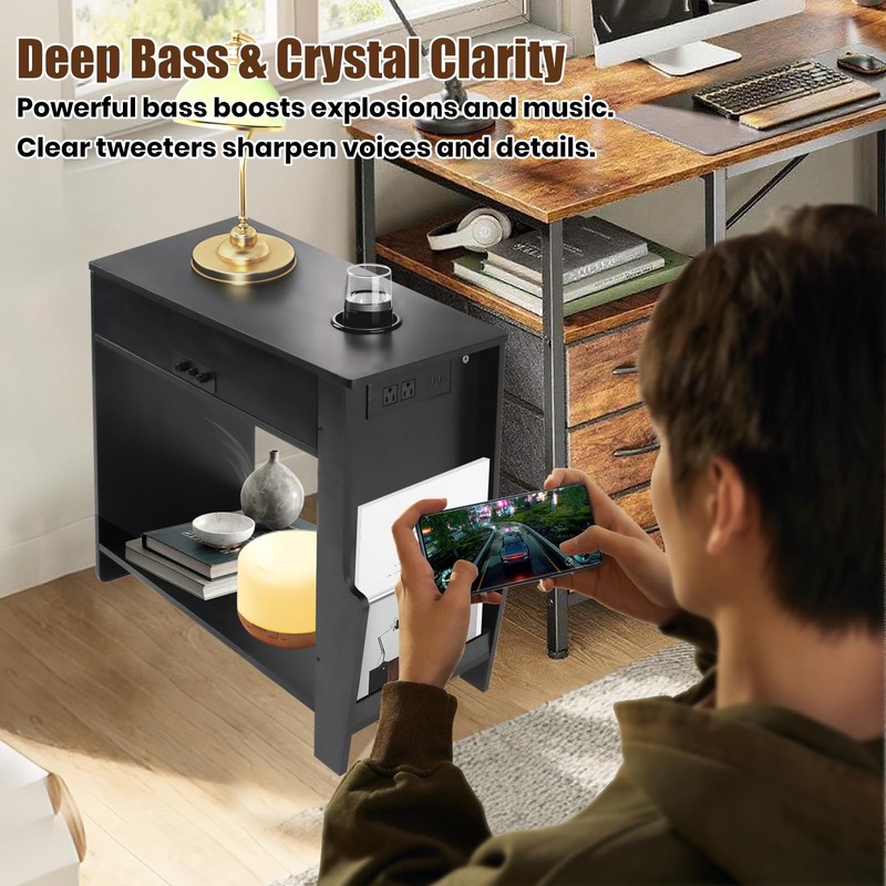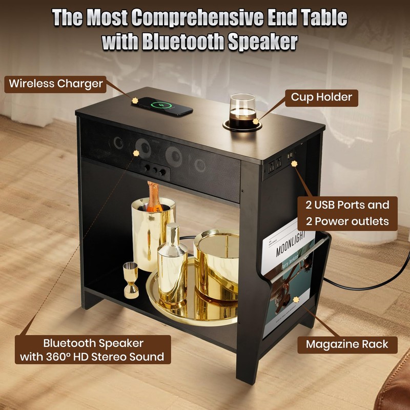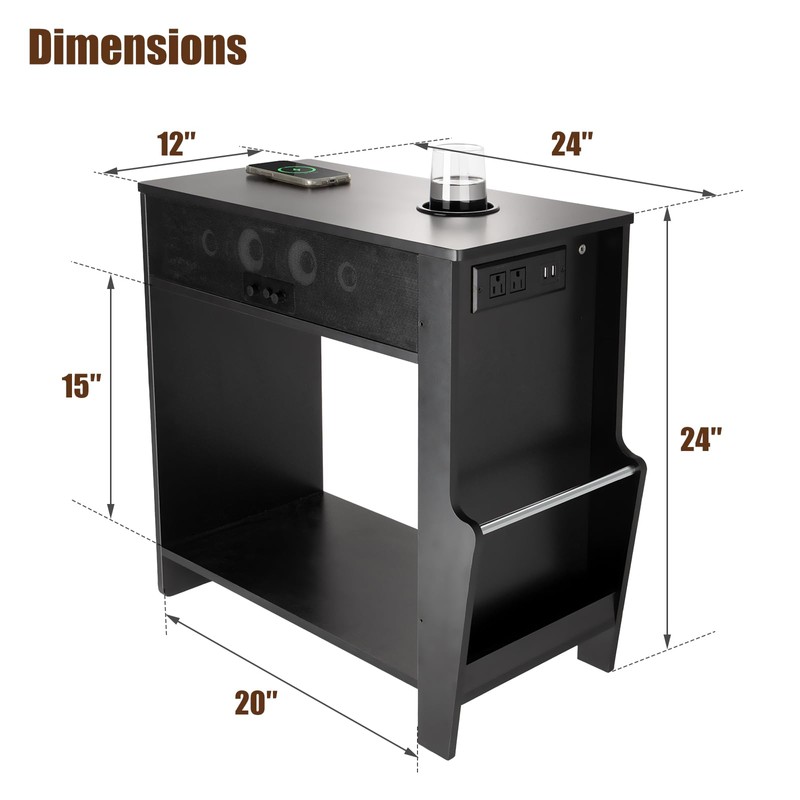 Smart End Table with 2 Subwoofer for Deep Bass, End Table with Bluetooth Speaker, Charging Station, Wireless Charger, Magazine Holder and Cup Holder, Bluetooth/AUX Connection, 24" W x 12" D x 24" H