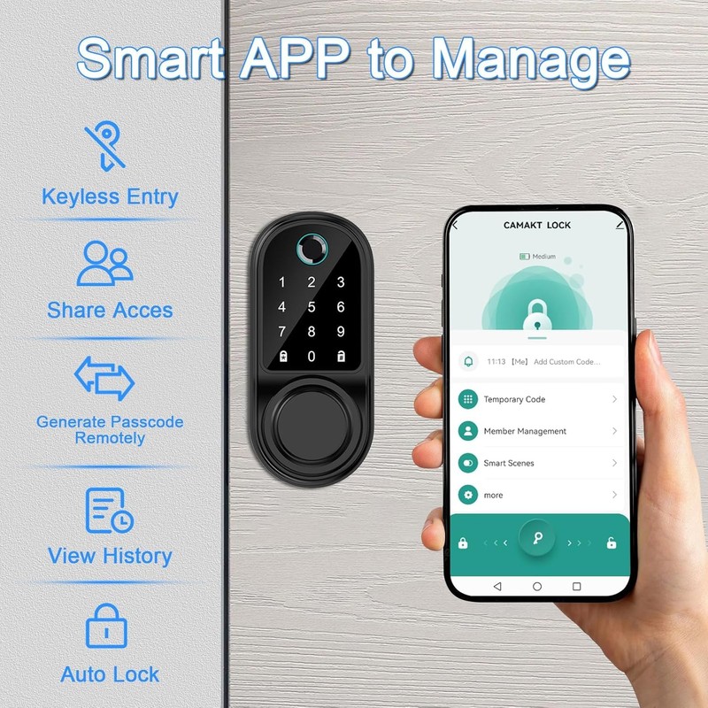 - 【Easy to Install & Battery Powered】 : Fits 99% of American front wooden doors. Our smart deadbolt lock can be installed in minutes by using just a screwdriver. No extra drilling required,suitable for both left and right-handed doors. The fingerprint door lock is powered with 4 AA batteries(Not Included) that can last up to 12 months. The Tuya Smart APP will remind you to replace the batteries when they're low.