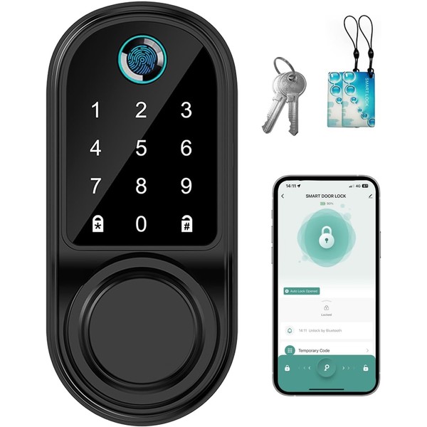 - 【Smart Door Lock】 : The keyless entry door lock features unlocking methods including fingerprint, password, App Control, IC card, and mechanical key. Fast Fingerprint Reading, Unlock effortlessly in just 0.3 second with high-precision biometric fingerprint recognition boasts a 99.99% accuracy rate,recording 100 sets of fingerprint in total.