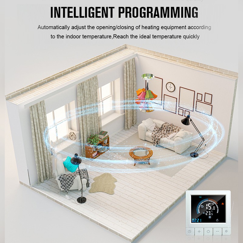 1、MULTIPLE CONTROLS: The intelligent thermostat supports remote control, intelligent timing, touch control, and programming time control. 2、APP CONTROL: Support for Tuya APP remote control, which can control the temperature at home through various intelligent voice devices. 3、CLEAR DISPLAY: The thermostat is equipped with LCD digital screen, which is clear and intuitive, and the button operation is more convenient. 4、SETTING RANGE: This smart temperature controller uses NTC sensor, which has high accuracy, with a temperature setting range of 5-60℃. 5、APPLICABLE SCENE: Can be used in hotels, villas, apartments, office buildings, hospitals, schools, shopping malls, sports venues, leisure places, warehouses, etc.