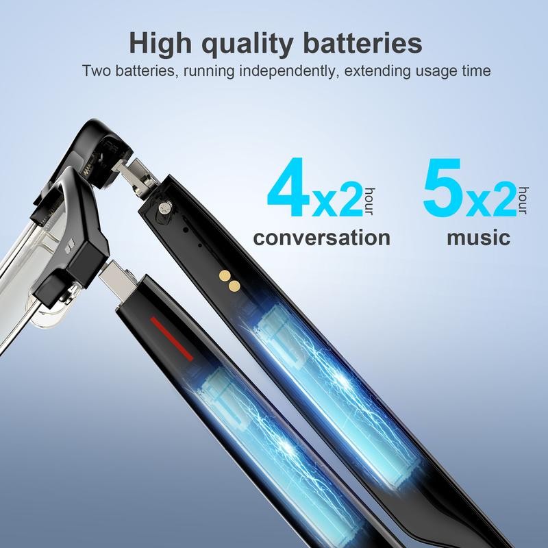 ALL Day Battery:Our smart sunglasses have a long-lasting battery life of up to 1-2 hours of media playback . Plus, you'll receive voice notifications when the battery is running low.