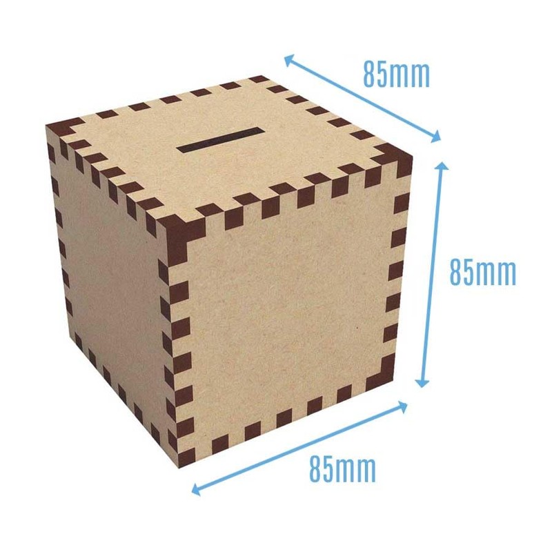 An 8.5cm wooden money box made out of the finest quality MDF and printed on all four sides with a unique design. The bottom is flat and the top has a slot for coins, the box itself is 85mm on each side, with a 35mm x 5mm coin slot, so please be sure it's suitable for you.
