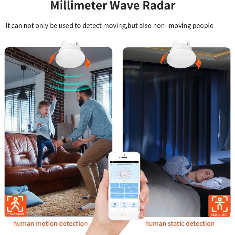 • Smart Human Presence Detector:the human presence sensor adopts millimeter wave radar,sensing human movement and static presence.It can detect the tiniest movement,even breathing and heatbeat.