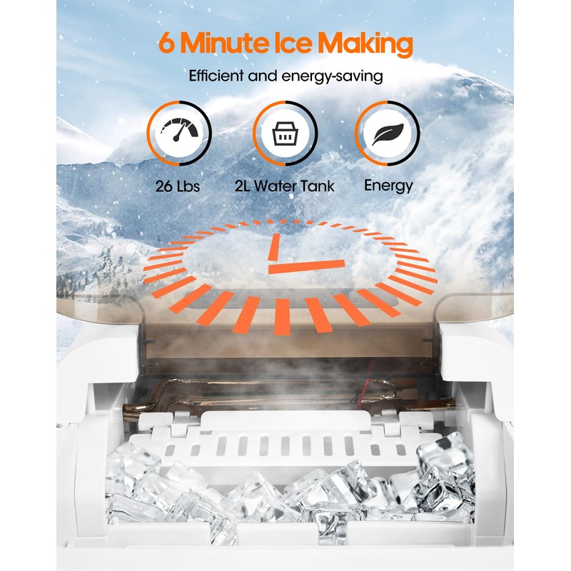 - Streamlined Ice Production with Smart Control: Our upgraded countertop ice maker delivers efficiency at its finest, crafting 9 bullet-shaped ice cubes in just 6 minutes. With a 1.3L water tank, it produces up to 26 pounds of ice within 24 hours. Now enhanced with smart APP control, you can remotely start and stop the ice-making process and monitor the progress from your smartphone. Choose between two ice cube sizes - small cubes for seafood and beer, or large cubes to rapidly chill your beverages.