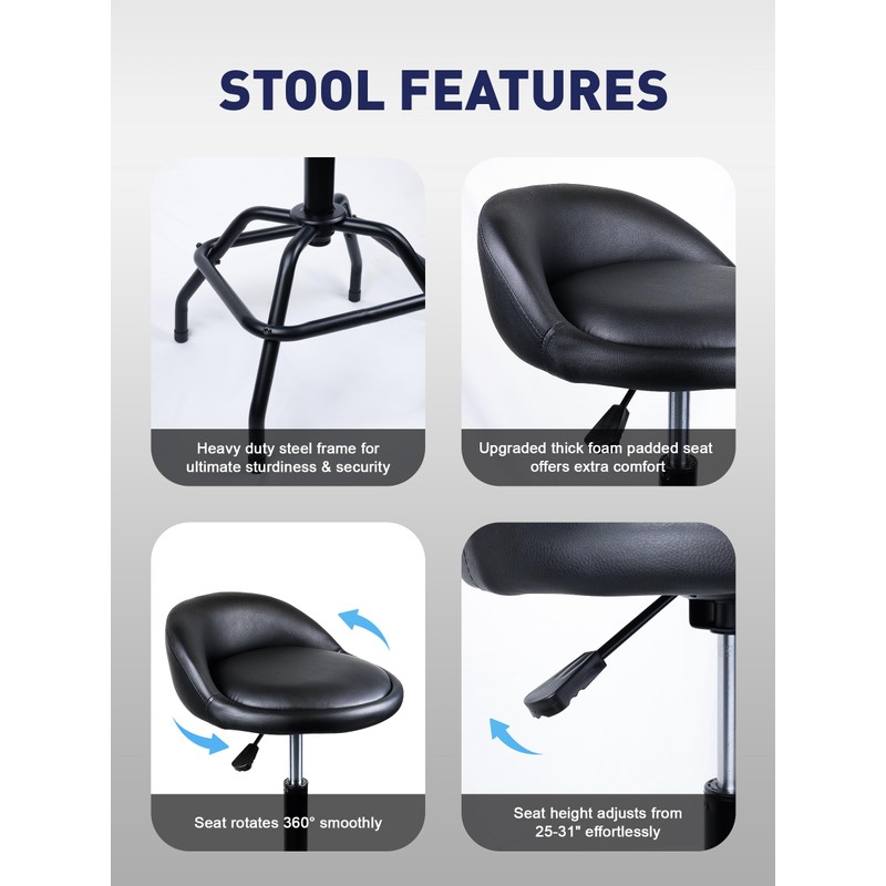 - Pneumatic action allows seat height of this stool chair adjusts from 25 to 31 inches quickly and smoothly