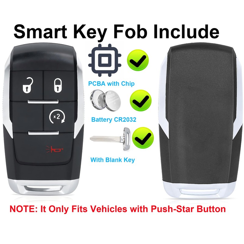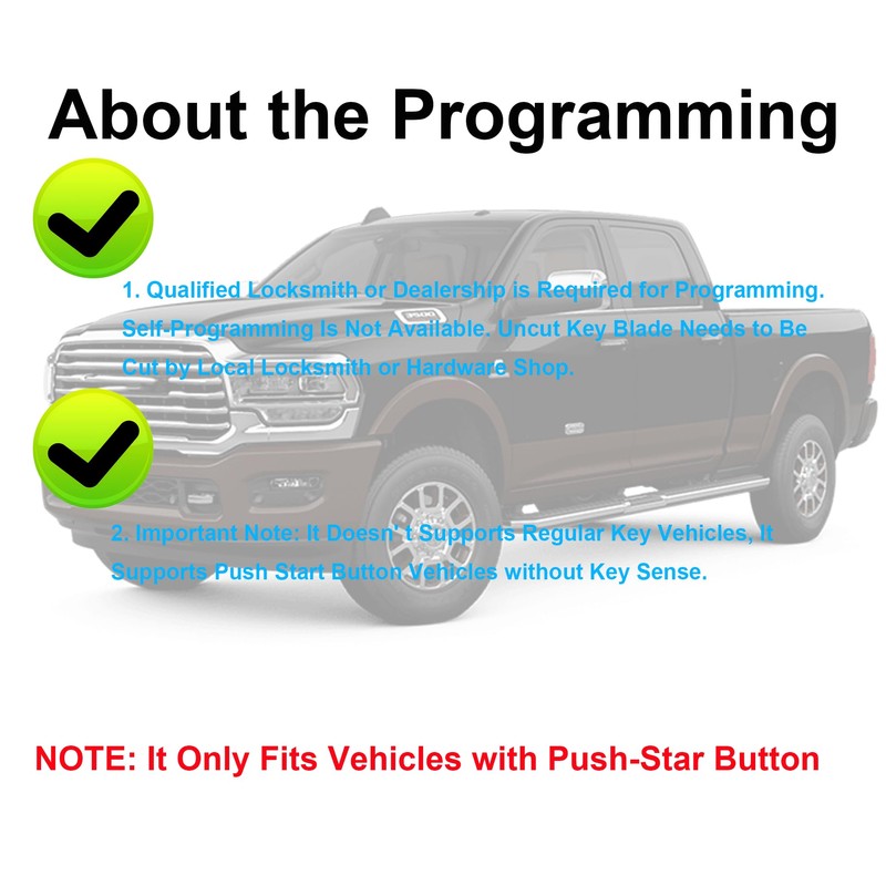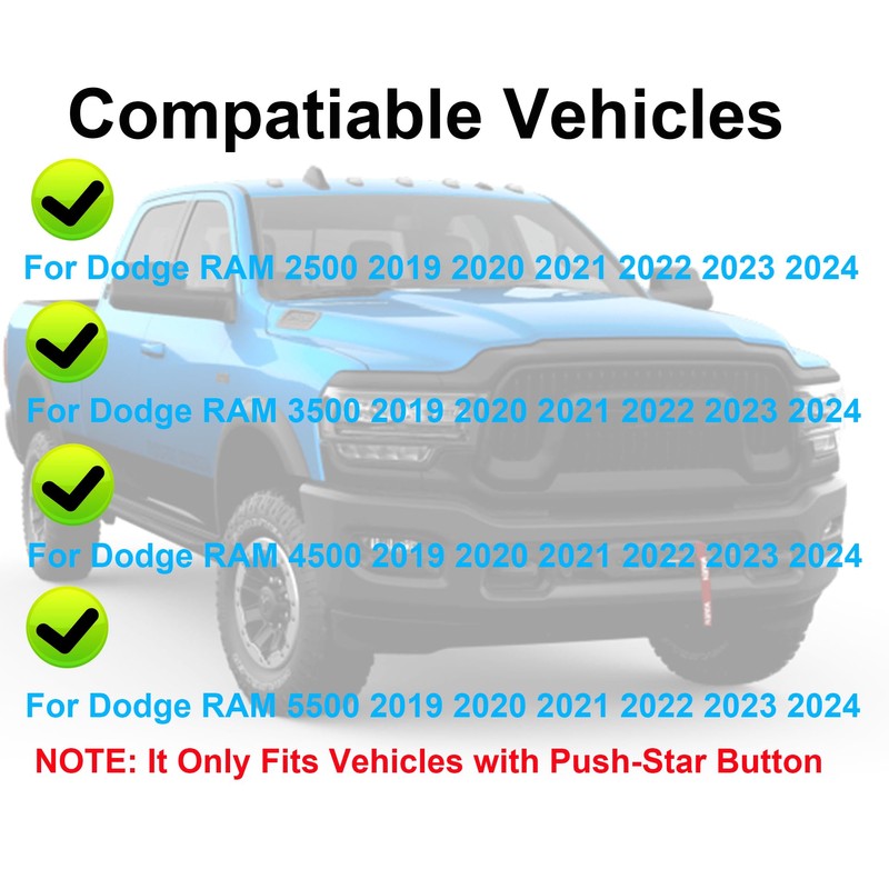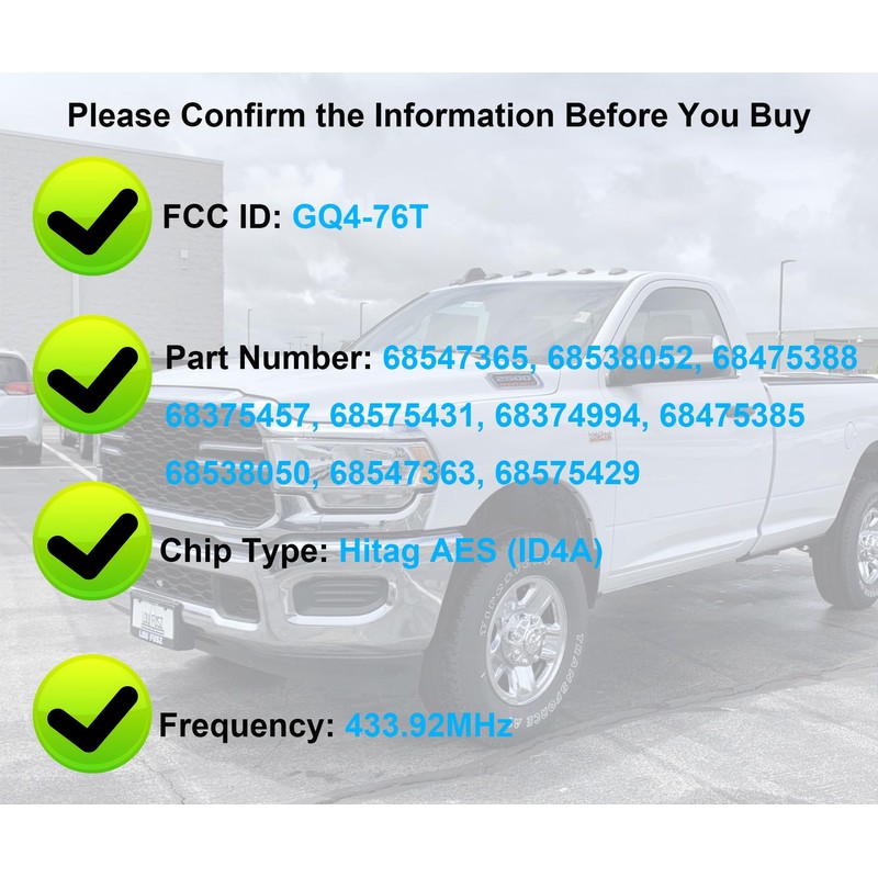 - 【Perfect Compatibility】Fit for Dodge RAM 2500 3500 4500 5500 2019 2020 2021 2022 2023 2024. Replace 68365327, FCC ID: GQ4-76T. Smart remote key frequency is 433 MHz, and Chip is 4A/Hitag AES
