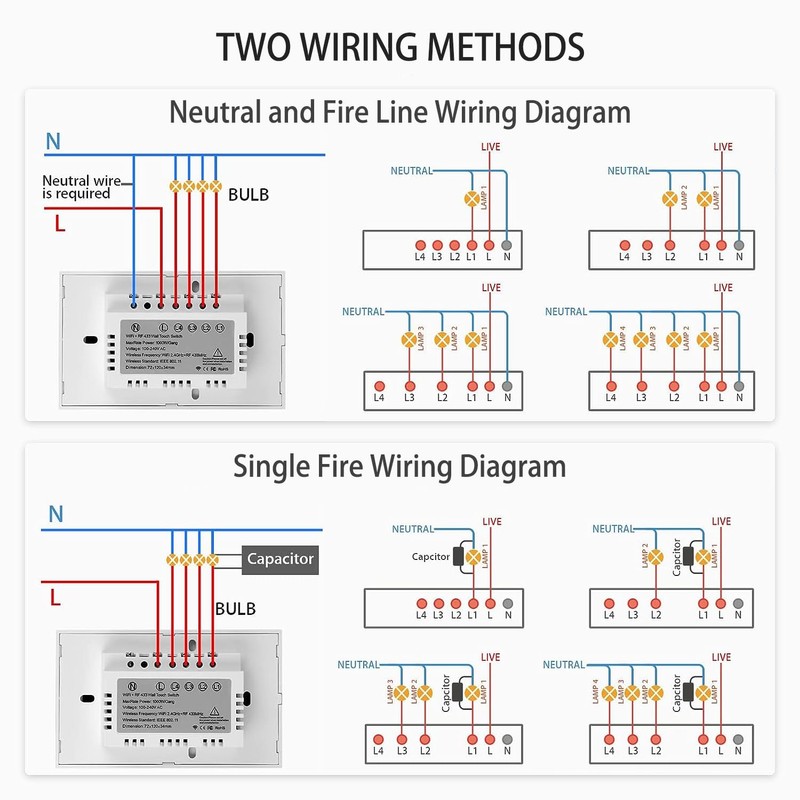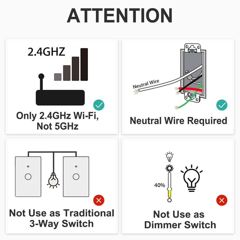 • 【Attention】WiFi light switches require a neutral wire, making installation more convenient; Only compatible with 2.4GHz WiFi; Only applicable to unipolar circuits; For detailed installation methods, please refer to product images.