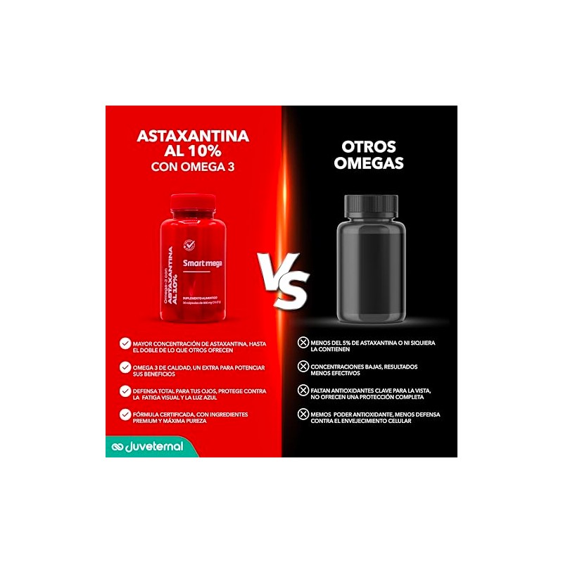 Acerca de este artículo Este suplemento premium combina los poderosos beneficios del Omega 3 (EPA y DHA) con la potente Astaxantina, un antioxidante natural de gran eficacia. Está formulado para optimizar la salud cardiovascular, proteger las células del daño oxidativo y mejorar la salud ocular y cognitiva. SALUD CARDIOVASCULAR: EPA y DHA ayudan a mantener niveles saludables de triglicéridos y a promover una circulación sanguínea óptima. ASTAXANTINA AL 10%: Formulada con el porcentaje ideal que el cuerpo puede asimilar, asegurando una utilización real del nutriente y sus beneficios antioxidantes. MEJORA LA VISIÓN: El DHA favorece la salud ocular y protege la retina. SALUD CEREBRAL: Aumenta la función cognitiva, memoria y concentración. BIENESTAR GENERAL: Combate la inflamación y mejora la energía y vitalidad. MODO DE USO: Tomar 1 cápsula al día, preferentemente con alimentos.