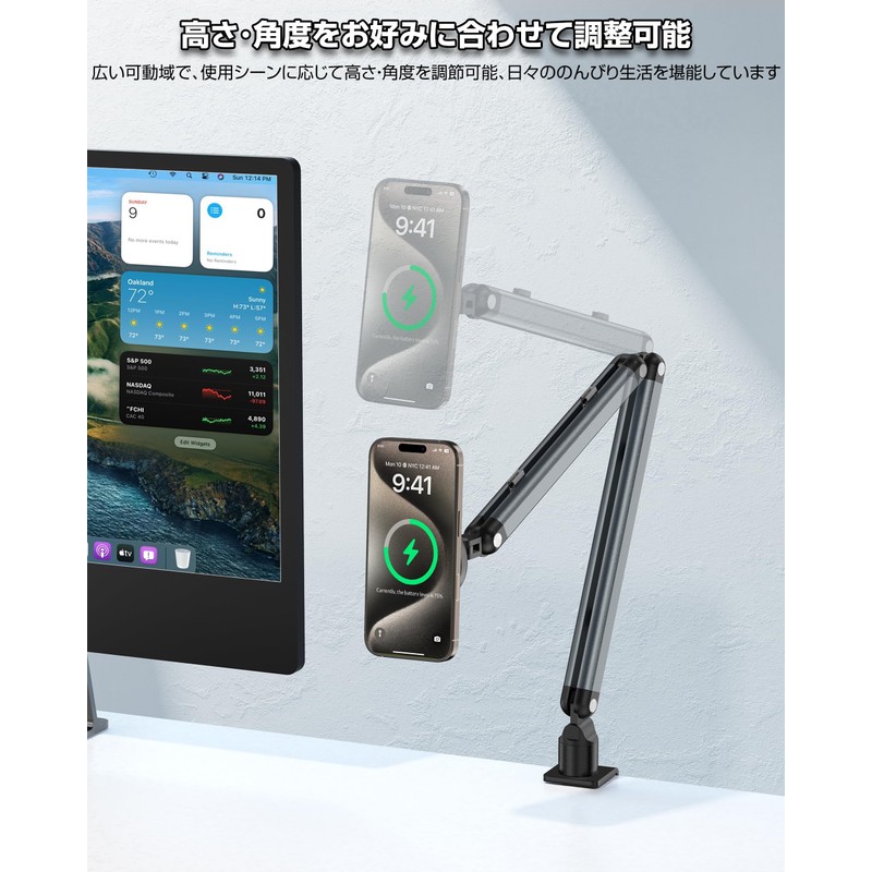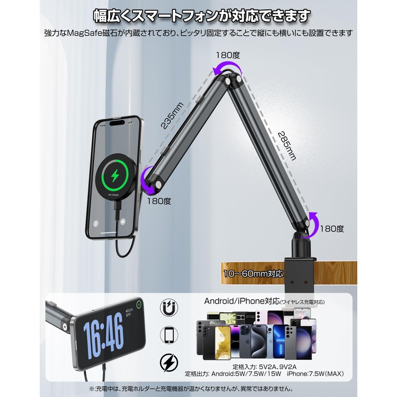 - Arm Stand, Wireless Charging: This product is equipped with a charging holder, and is a magnetic smartphone arm stand with a wide range of motion. The folding arm has 6 movable joints, and the height and angle can be adjusted steplessly. What's more, it can be stored when not in use, and it can be extended to reach when in use, making effective use of space. It also has a built-in charging holder, so you can reduce the worry of your smartphone running out of battery or running out of power during long periods of time playing games, live broadcasting, or watching videos