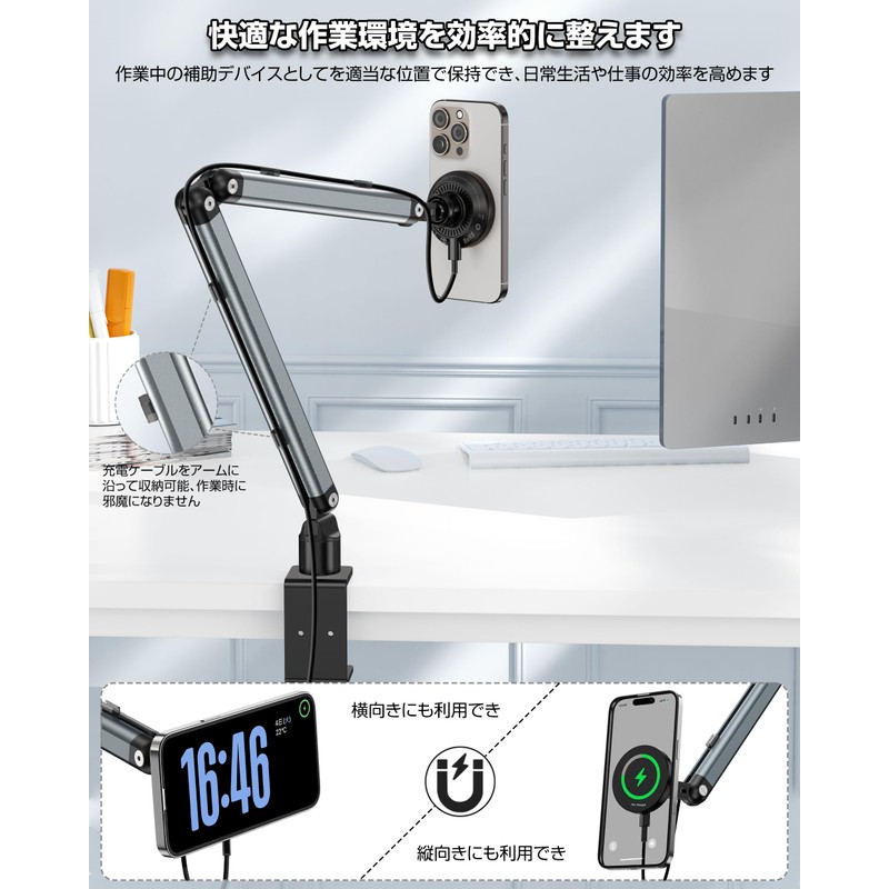 - Magnetic and Cable Guide Included: The charging holder has a powerful MagSafe magnet built in, so it can be installed in either portrait or landscape orientation, allowing you to use your smartphone while charging. In addition, the model number of the iPhone 12 series and later can be used by magnetic. For smartphones that are not compatible with MagSafe, you can attach the included magnetic plate to the back of your smartphone and then use it magnetically. In addition, the arm has a cable guide that allows the power cable to be neatly organized along the arm while charging, creating a comfortable work environment that prevents the cable from interfering with your work