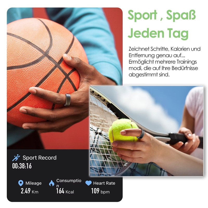 - Super light smart ring, only 4.4 g: This fashionable, finely crafted and sporty smart ring impresses with its amazing weight of just 4.4 grams. Its elegant design ensures that you can hardly feel it during everyday activities or even during intense workouts without causing additional strain on the wrist. This reduces the risk of injury and also supports the increase in performance during sports.