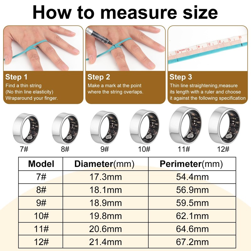 - 【Choose Size & Charge the Ring Before Buy & Using It】Before purchasing the Smart Ring, Follow the way we measure the circumference of finger to choose the right ring size,It stayed in warehouse for a few weeks, due to the limited battery standby time, please fully charge when you receive the smart ring, so that it can work normally