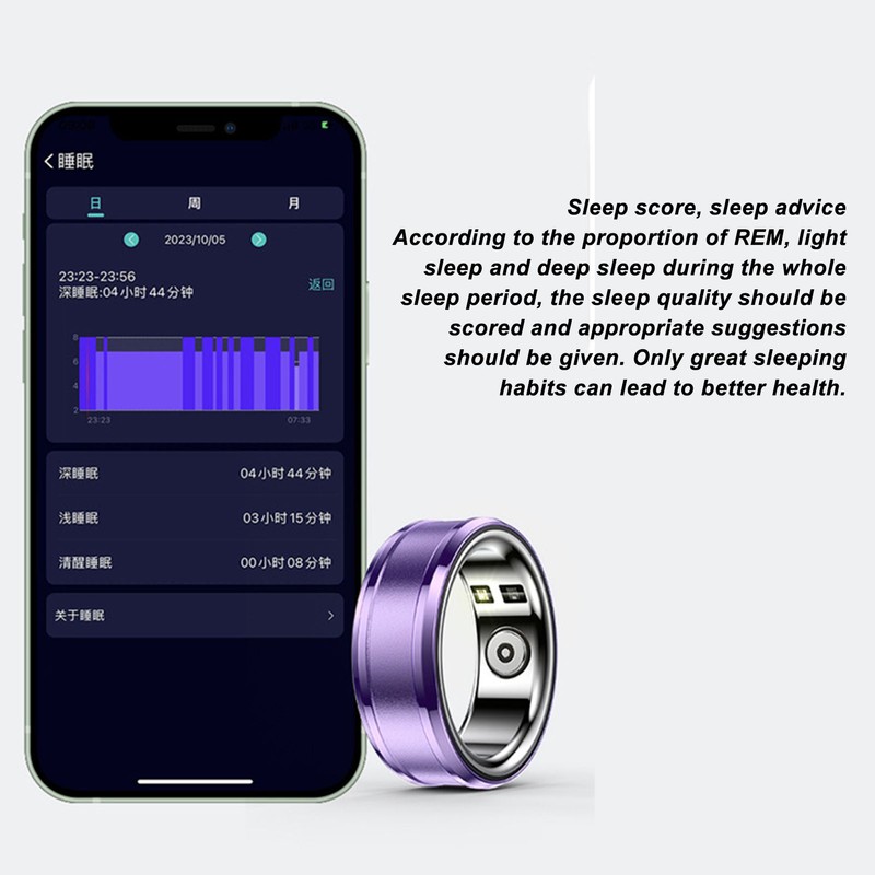 1、Elegant Design: The smart ring has excellent appearance and hardware. Featuring a minimalist design and a stainless steel inner ring, it outperforms conventional wearable devices. 2、Comprehensive Sleep Analysis: By analyzing sleep efficiency, latency, time, stages, movements, and temperature, this ring provides a comprehensive understanding of sleep behavior and body condition. The sleep tracking feature makes it an ideal health companion. 3、Boost Your Fitness: Experience a diverse range of indoor and outdoor activities through the smart ring application. Simply wear the ring to effortlessly track steps, distance, calories, and pace. Analyze map routes and detailed exercise data to enhance your performance and push beyond your limits. 4、Smartphone Camera Remote Control: The ring doubles as a remote shutter release, allowing you to take selfies or group photos without needing assistance. Even when you're alone, you can record perfect shots with ease. 5、All Day Monitoring: This smart ring utilizes energy saving technology to ensure continuous monitoring for 3 to 5 days without the need for charging. Made with polished aluminum titanium alloy for durability and medical grade 316L stainless steel for comfort, it is also waterproof with an IP68 rating to guarantee longevity. 6、Comes with an APP: The smart health ring's tracking data can be viewed for free on a mobile application, without any subscription fees. This device supports for Android 6.0 and for iOS 11.0 and above.
