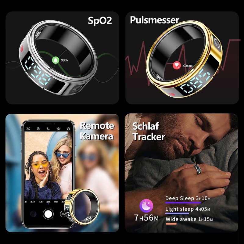- Smart ring with LED screen: This smart ring is equipped with touch screen, you can check the time, steps, heart rate, blood oxygen, sleep and battery indicator directly on the display of the ring. No frequent removal of the phone to check data. Only 3.4 g, ultimate lightness: This trendy, refined, elegant and designed for sports enthusiasts ring has an amazingly light weight of 3.4 g.