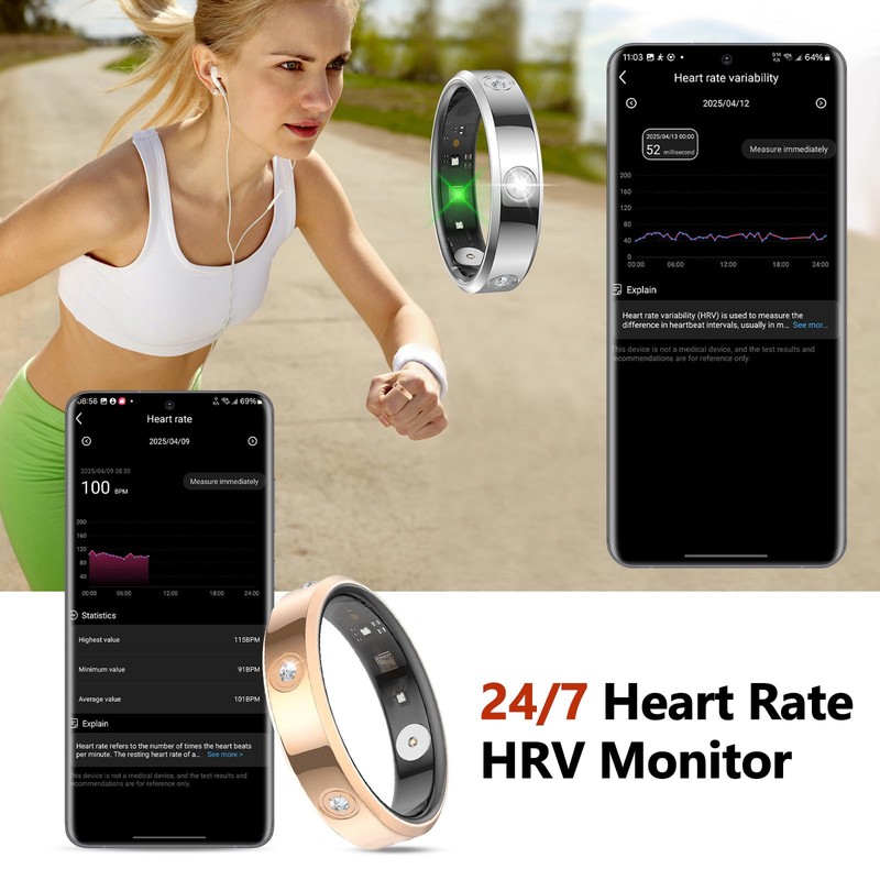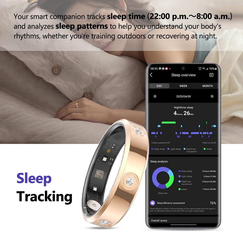 • Health Ring: Smart ring uses optical sensor to monitor your body data - heart rate, HRV, providing intuitive data support. The built-in gravity sensor estimates your sleep time and provides feedback on sleep quality as a reference.
