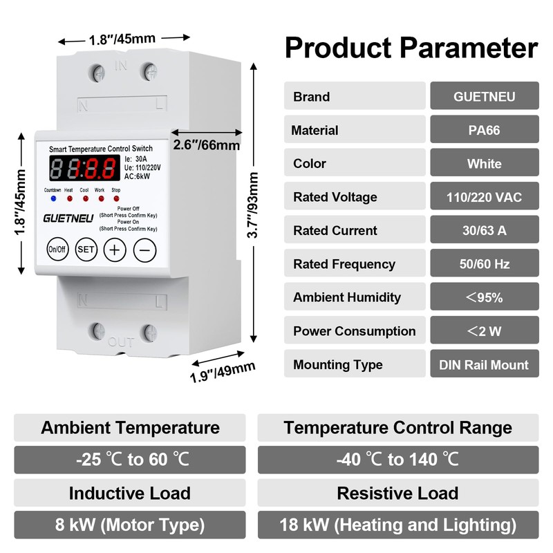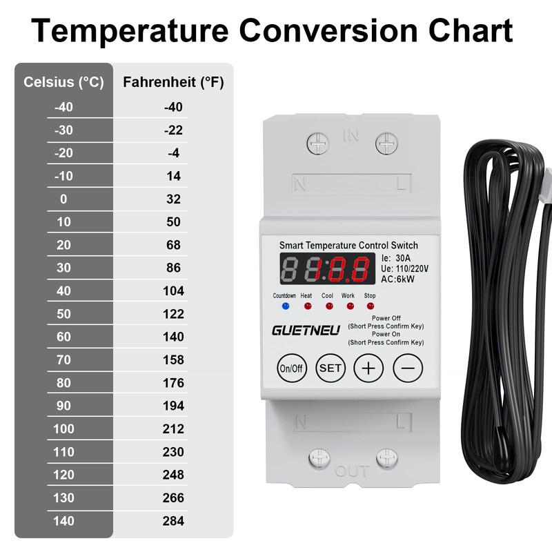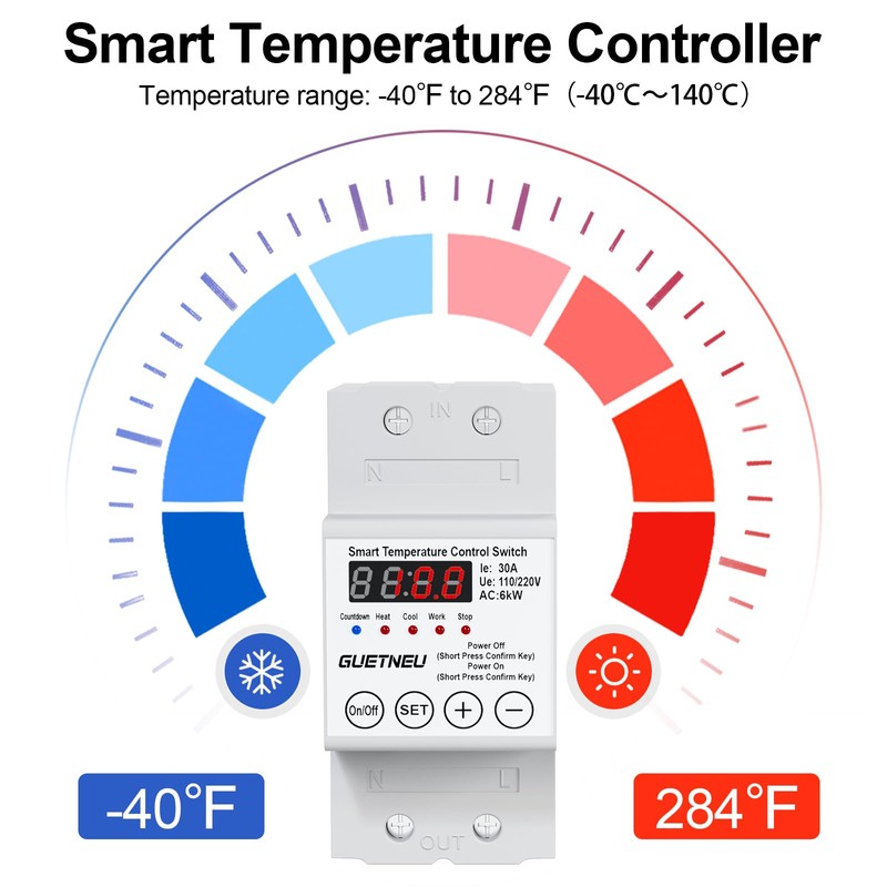 Introducing the GUETNEU Smart Temperature Controller, an advanced LED display switch designed for precise temperature management. With an adjustable range from -40℉ to 284℉, it’s ideal for aquaculture, hatcheries, greenhouse cultivation, and geothermal heating. Its robust design meets diverse temperature control needs, ensuring optimal environments with ease.