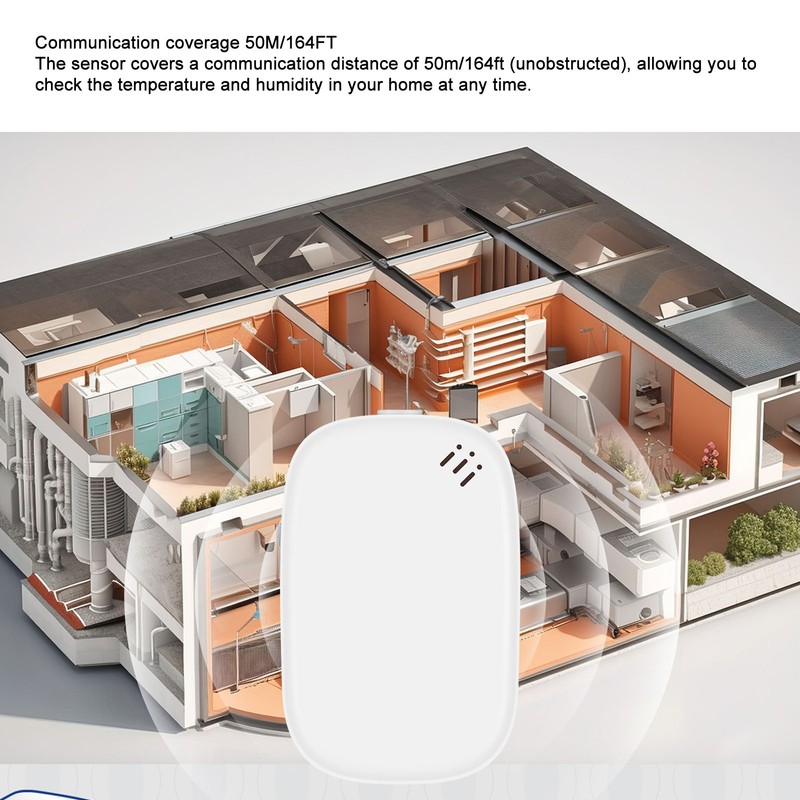 1、Wide Coverage: With a coverage of 50m/164ft (unobstructed), the smart temperature humidity sensor allows you to monitor the temperature and humidity from anywhere in your home. 2、High Sensitivity: The sensor offers high sensitivity, instantly detecting changes in temperature or humidity as small as 0.3°C or 5%. These changes are promptly displayed on the APP, providing real time updates. 3、Long Lasting Battery Life: Equipped with a CR2032 button battery, the sensor can be used continuously for up to one year, eliminating the need for frequent battery replacements. When the battery is low, you will receive notifications through the PP. 4、Care for Your Living Space: Instead of worrying about weather changes every day, having a smart temperature humidity sensor allows you to easily check the current environmental conditions in your home. It is highly suitable for household use. 5、Easy Installation: The smart temperature humidity sensor comes with adhesive tape on the back, allowing you to conveniently stick it to any desired location.