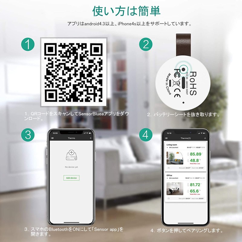- Alarm Function: It has a function that notifies your smartphone and alerts when the temperature and humidity range is beyond the specified temperature and humidity. The temperature ranges from -4°F to 145°F (-20°C to 65°C), so you can place it in your living room, bedroom, baby room, office or anywhere you want to detect abnormalities, such as refrigerator, balcony, car, cigar box, pet bed, medicine box, etc