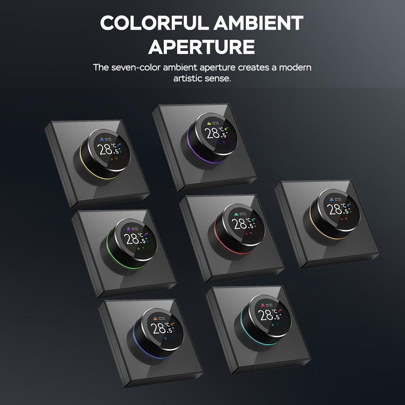 • UNIQUE AMBIENCE LIGHT: Knob thermostat for Home allows you to switch color ambience apertures at will. By adjusting the function area, the color of the unreal image ambiance aperture changes synchronously with the color of the function area