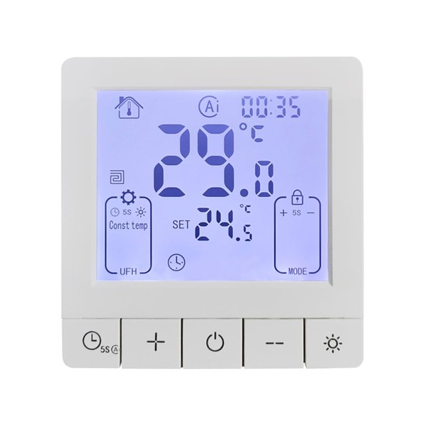 • 24H Timer: Our room thermostat includes a 24-hour timer functionality, allowing you to set specific time intervals for your device to operate. This feature is particularly useful for controlling the device's operation during specific time periods, ensuring energy efficiency and cost savings.