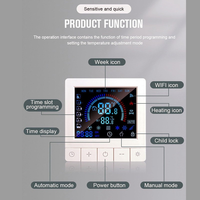 - Intelligent LCD Display: The thermostat is equipped with an LCD display, which can clearly show the current room temperature, set temperature, working and information, the is intuitive and convenient.