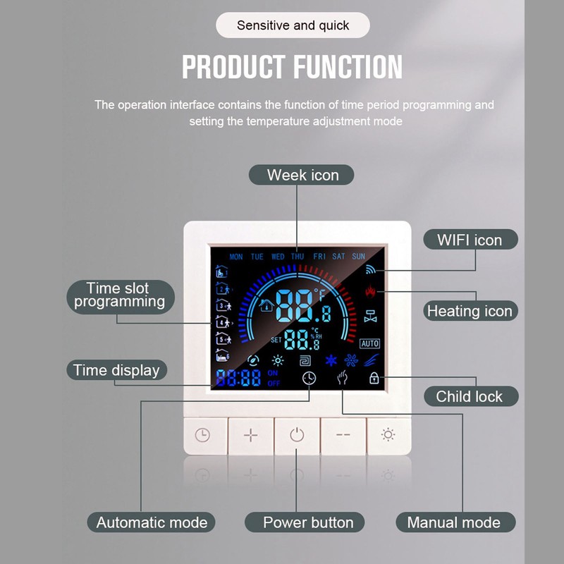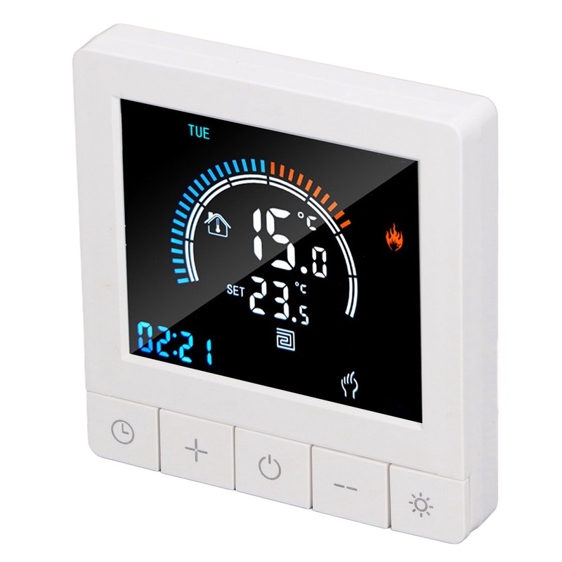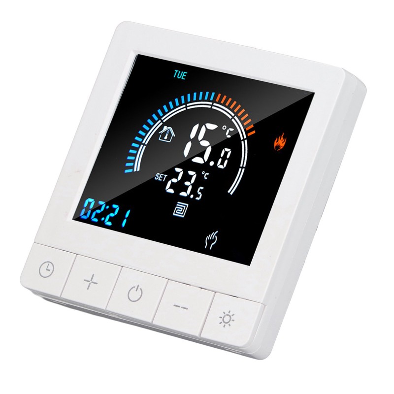 1、Intelligent LCD Display: The thermostat is equipped with an LCD display, which can clearly show the current room temperature, set temperature, working mode and other information, the operation is more intuitive and convenient. 2、Programmable Function: The thermostat comes with a programming function, which allows users to set different temperatures at different times according to their needs, intelligently controlling the underfloor heating, improving comfort and saving energy at the same time. 3、Intelligent Temperature Control: The thermostat is designed for smart home, which can precisely control the temperature of underfloor heating to avoid overheating or overcooling and provide a comfortable indoor environment. 4、Widely Used: The thermostat is suitable for home, office, shopping malls, hotels, nursing homes and other types of places, can meet the needs of different places on the floor heating temperature control. 5、Exquisite Appearance: Equipped with a color LCD screen, it is not only practical but also decorative, which can add a sense of fashion to the place.