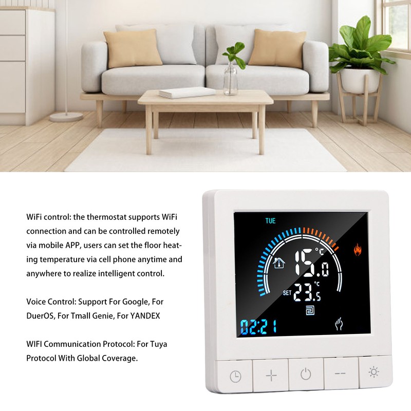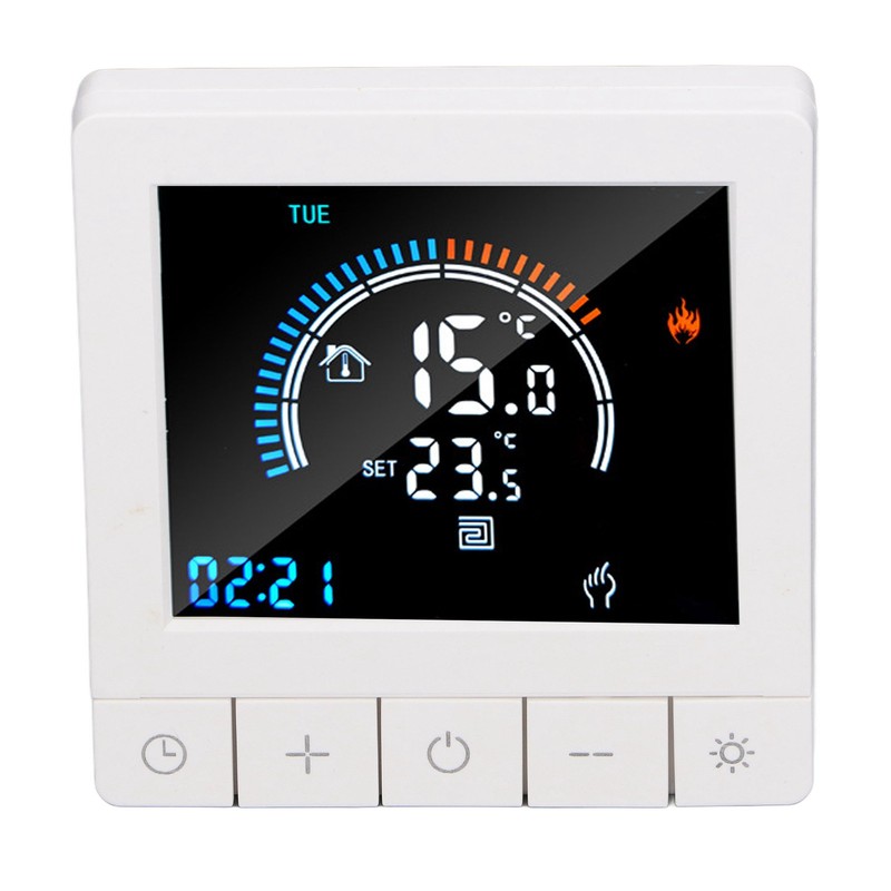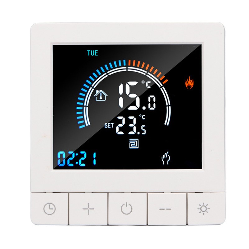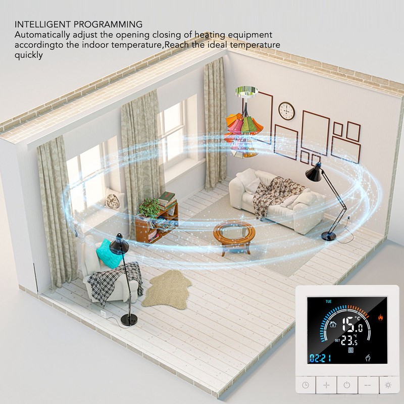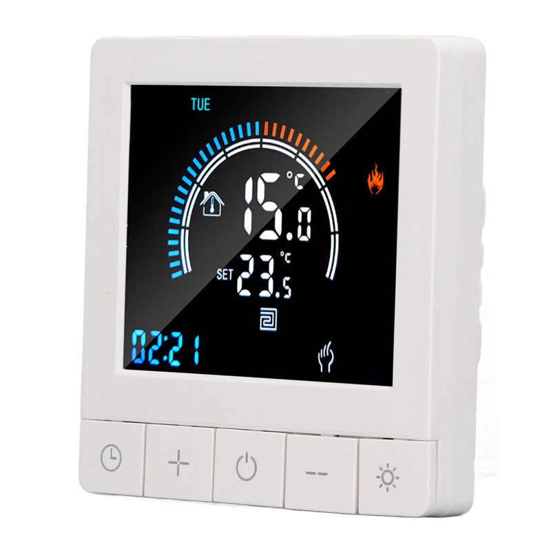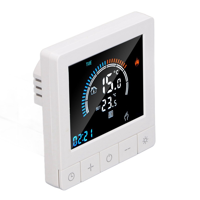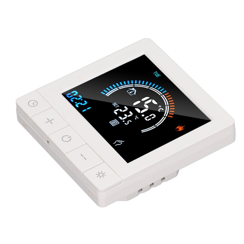 1、Intelligent LCD Display: The thermostat is equipped with an LCD display, which can clearly show the current room temperature, set temperature, working mode and other information, the operation is more intuitive and convenient. 2、Programmable Function: The thermostat comes with a programming function, which allows users to set different temperatures at different times according to their needs, intelligently controlling the underfloor heating, improving comfort and saving energy at the same time. 3、Intelligent Temperature Control: The thermostat is designed for smart home, which can precisely control the temperature of underfloor heating to avoid overheating or overcooling and provide a comfortable indoor environment. 4、Widely Used: The thermostat is suitable for home, office, shopping malls, hotels, nursing homes and other types of places, can meet the needs of different places on the floor heating temperature control. 5、Exquisite Appearance: Equipped with a color LCD screen, it is not only practical but also decorative, which can add a sense of fashion to the place.