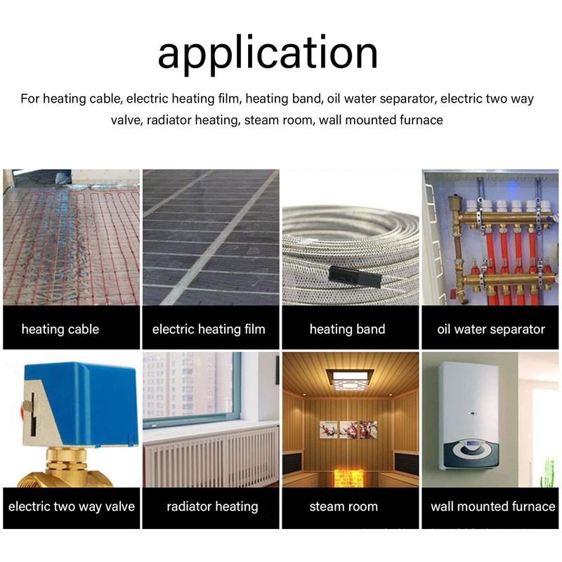 Application: Heating cable, electric heating film, heating band, oil water separator, electric two way valve, radiator heating, steam room, wall mounted furnace