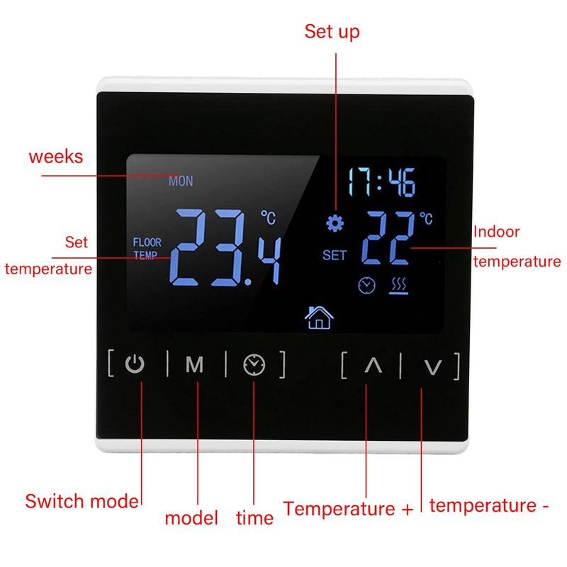 - [Easy-to-Use Touch Screen] The floor heating thermostat features a sensitive touch screen design for convenient and quick switching.