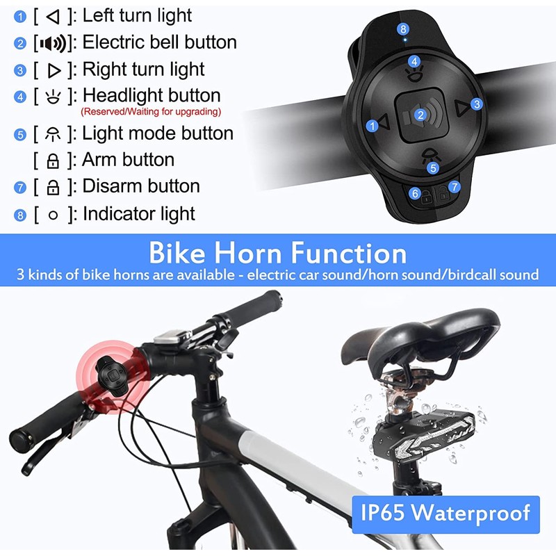 - VIBRATION ALARM and BIKE HORN: Anti-theft alarm model triggered by vibration, up to 110db LOUD alarm, effectively to scare off thieves and attract people's attention. 7 levels adjustable sensitivity from gently touch to push or beat.3 horn sounds are selectable by the remote. When press the electric bell button on the remote. a 110db horn sound will go off from the taillight to remind people, and aslo remind you where is your vehicle parking.