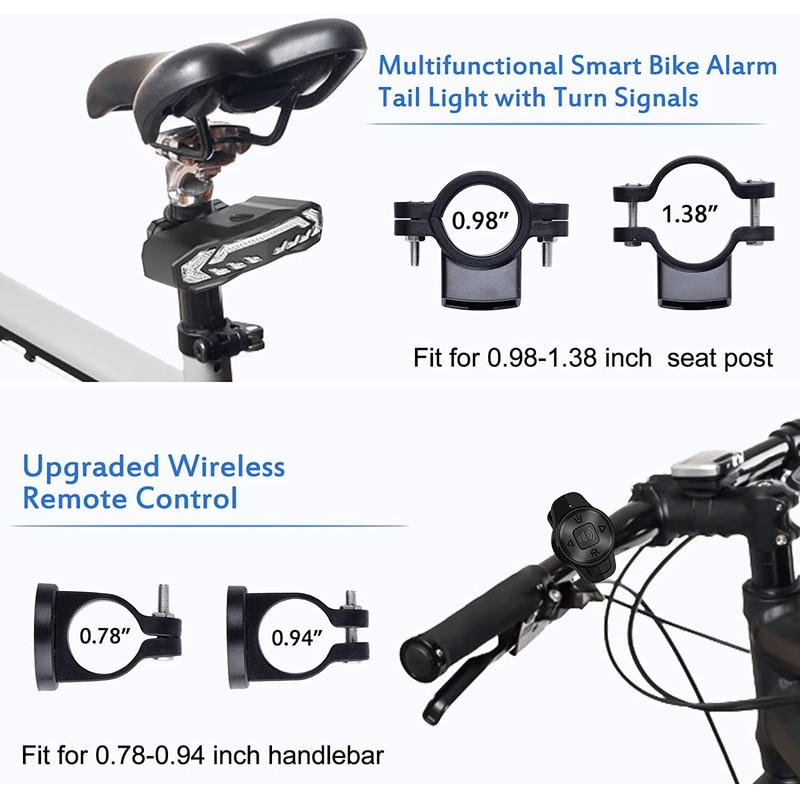 - Universal Size: The remote control clamps easily to a 0.78-0.94 inch handlebar. The bike light can easily be mounted to a 0.98 -1.38 inch seat post bracket. Suitable for almost all bikes, ebikes, mobility scooter, motorcycle, utv tricycle.