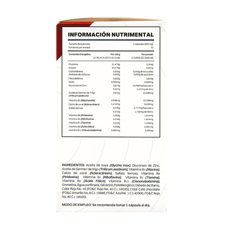 BENEFICIOS: ✅ La tiamina es esencial para el metabolismo de los carbohidratos y la producción de energía en el cuerpo. ✅ La riboflavina está involucrada en la producción de energía y ayuda en la metabolización de grasas, proteínas y carbohidratos. ✅ La niacina es esencial para el metabolismo de los alimentos y la producción de energía. ✅ La piridoxina es importante para la formación de glóbulos rojos, el funcionamiento del sistema inmunológico ✅ La cobalamina es crucial para la formación de glóbulos rojos y el funcionamiento del sistema nervioso INGREDIENTES: Aceite de soya (Glycine max), Gluconato de Zinc, Aceite de Germen de Trigo (Triticum aestivum), Vitamina B3 (Niacina), Calcio de coral (Sclecratiniam), Sulfato ferroso, Vitamina B6 (Piridoxina), Vitamina B2 (Riboflavina), Vitamina Bi (Tiamina), Vitamina Be/ (Ácido Fólico), Vitamina Bi2 (Cianocobalamina), Grenetina, Agua purificada. MODO DE USO: Se recomienda tomar una cápsula al día .