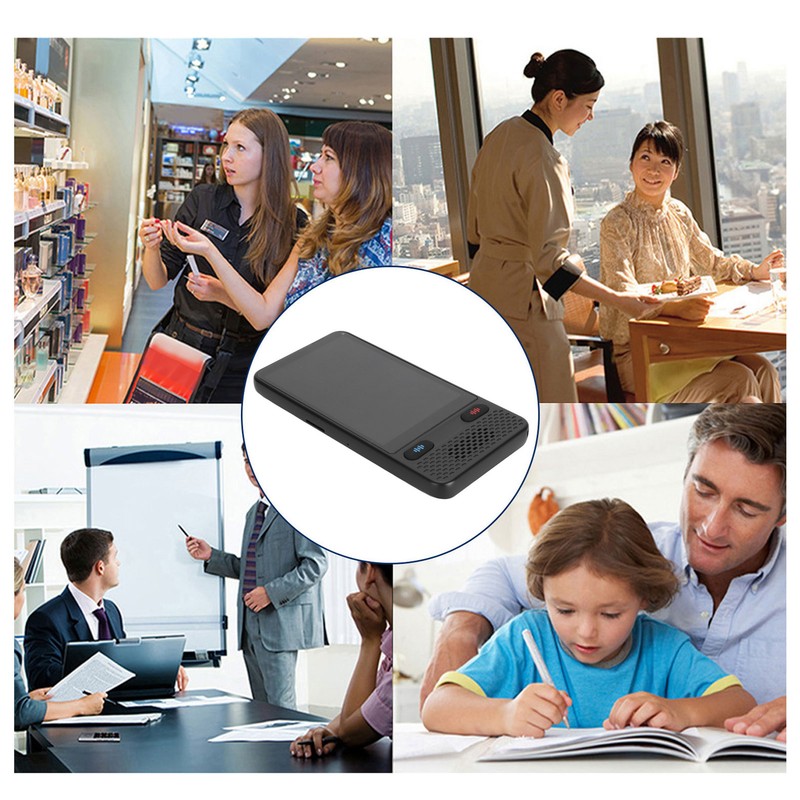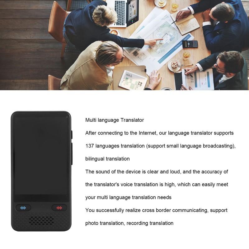 1、Multi Language Translator: After connecting to the Internet, our language translator supports 137 languages translation (support small language broadcasting), bilingual translation, clear and loud device voice, high accuracy of translator voice translation, easily meet your multi language translation needs. You successfully realize cross border communicating, support photo translation, recording translation. 2、Bidirectional Voice and Multifunctional Translation: Both language A and language B can be converted to another language. Click on the screen to select a language pair. For example, you can select English‑Spanish, Spanish‑English. In addition, our translator is perfect for traveling, shopping, entertaining, communicating with friends or making new friends while learning a foreign language. 3、Excellent Recording Sound Quality: Language translation device with HD recording, independent noise canceling microphone, can accurately input language in noisy environment, always keep the sound clear, also easy to repeat listening, if other people can't hear it obviously, you can play it again. 4、Real Time Voice Translation: This translation device comes with a 3.5 inch color touch screen, when you say what you want to translate, the translation will also turn into text on the screen. Very helpful to talk with others and understand each other better, support local music MP3 and MP4 mode, place the sound MP3 or video MP4 file inside your own memory card, insert the memory card into the translator to play it (Note: the product does not include a memory card, you need to bring your own, maximum support for 32GB). 5、Intelligent Translation: Simple operation, no need to install the application on your phone, just connect this device with WIFI to start translation. Noise canceling microphone design makes the voice loud and clear. 1500mAh high capacity battery, standby for more than 7 days, continuous work for more than 8 hours.