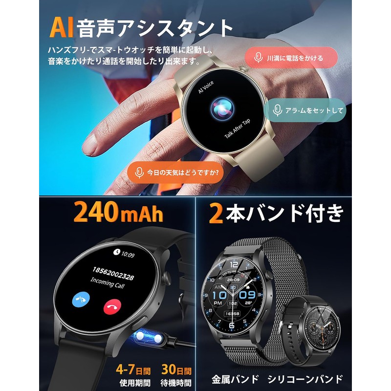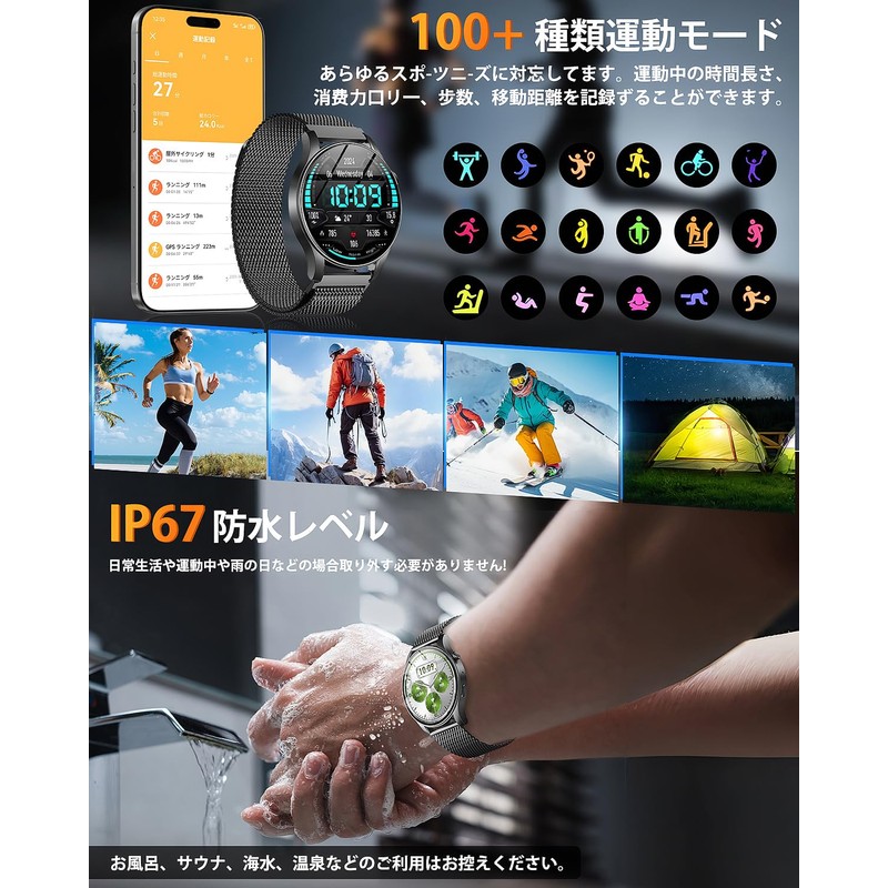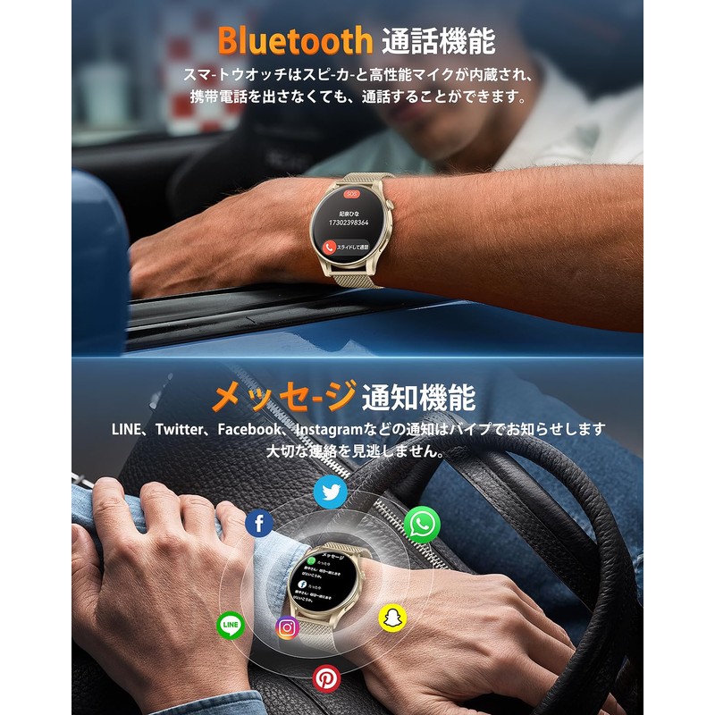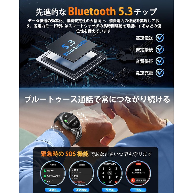- (Equipped with state-of-the-art Bluetooth 5.3 / Supports phone calls) The smart watch is equipped with a built-in speaker and high-performance microphone, so you can make calls without taking out your smartphone. After connecting to the dedicated app, you can answer/reject or mute calls directly from your smart watch. You can use it conveniently when your hands are full, even when driving or playing sports