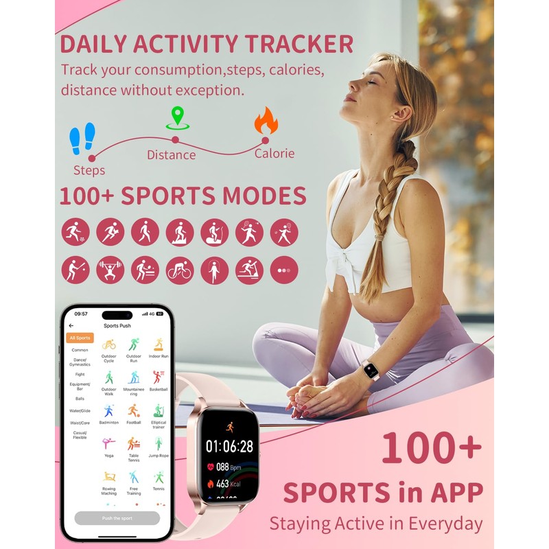 - DAILY ACTIVITY DATA & 100+ SPORT MODES: Fitness watch for women automatically tracks your steps, distance, and calories throughout the day, so that you can know whether your total steps in a day reach the recommended steps per day, help you stay healthy. Fitness trackers have 100+ sports modes, during workout, it can monitor your heart rate, steps, distance, and calories in real time, as well as exercise duration. The easy-to-read data and charts available in the app help you track your progress and fine-tune your fitness routine for more effective results