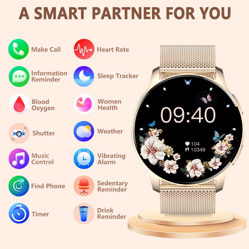- BLUETOOTH CALL & SMART NOTIFICATIONS: Smart watches for women with a microphone and speaker, you can make and receive calls with clarity, keeping in touch with your family and friends. Women smart watch will vibration to alert you when it receives SMS, and SNS notifications(Instagram, Twitter, Facebook, etc. CAN NOT TEXT)Never miss a notification or call again. Your phone's AI voice assistant can be controlled through the smartwatch