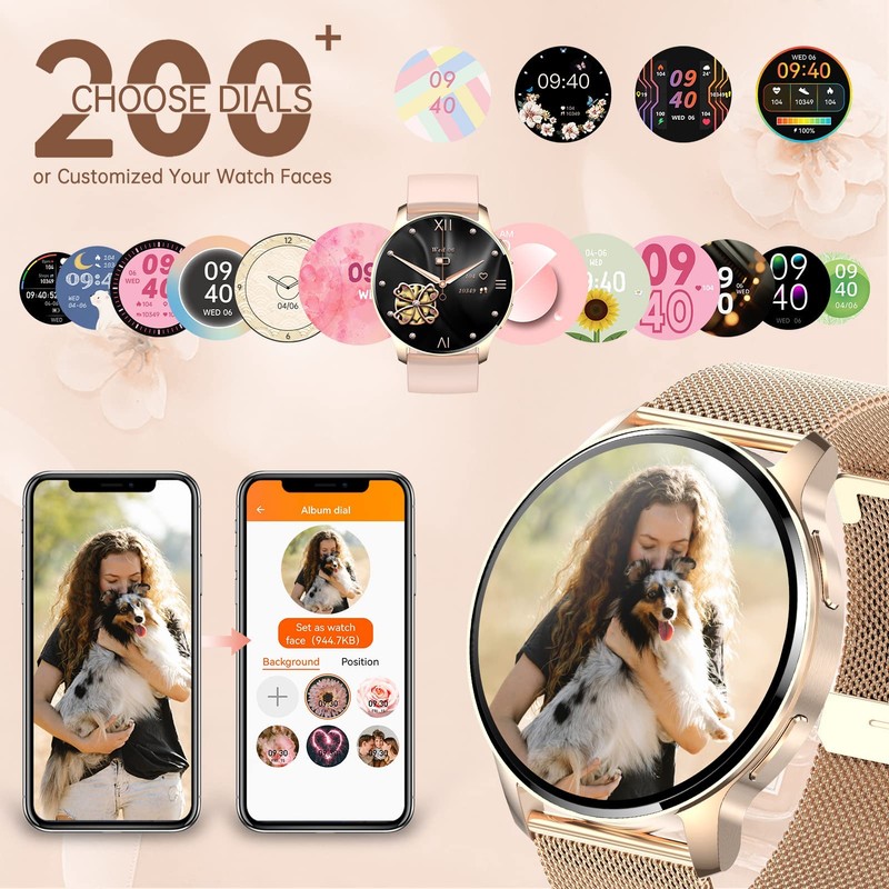- 200+ DIALS &CUSTOMIZED WATCH FACE: Round smart watch with 1.32 inch high-definition screen and ultra-thin metal frame, bringing a more comfortable touch and excellent visual experience. App has 200+ free watch faces to choose from. You can also make custom dials with your favorite photos, such as your family, pets. Smartwatch comes with 3 bands, the rose gold stainless steel band is dressy, and pink and blue-violet light silicone bands are casual, easy to find a watch band that suits your style