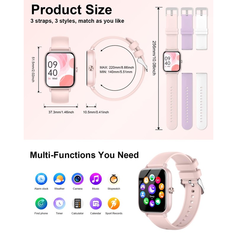 - 【200+ Watch Faces & Custom Watch Faces】This exquisite square Android smartwatch has 200+ watch faces to change, you can also DIY watch faces with your favorite photos (such as family, pets). This women's watch comes with 3 kinds of watch straps, pink, purple and white silicone watch straps are comfortable and casual, you can change them according to your mood, daily outfit or occasion, making the watch more diverse.
