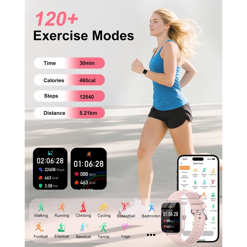- 【Practical Fitness Tracking Watch】The fitness tracking watch supports 120+ exercise modes, such as walking, running, jumping rope, cycling, yoga, soccer, basketball, etc. The fitness watches for women will track your exercise time, steps, distance, calories burned and heart rate index, you can view more detailed data on the app to help you achieve your fitness goals and improve the efficiency of your exercise, and become a good helper for your exercise and fitness