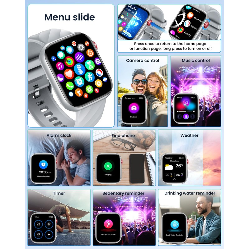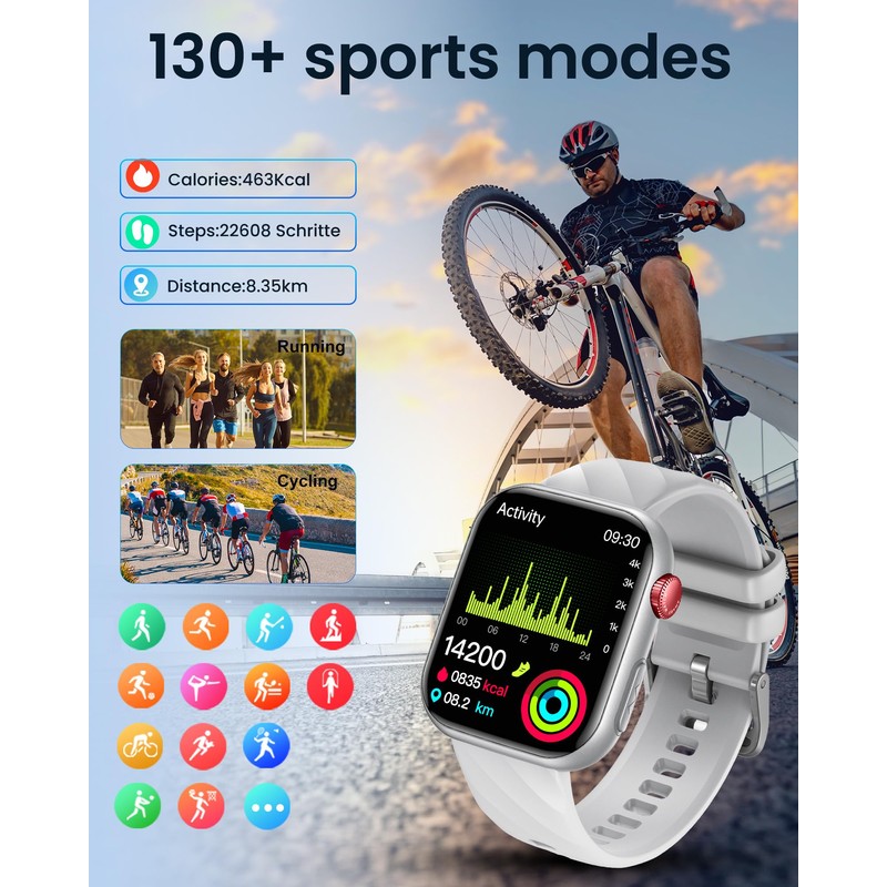 - This men's fitness watch offers over 130+ sports modes, you can choose the type of exercise according to your needs. Pedometer watch records steps, kilometres and calories burned. Smartwatch waterproof IP67, it is completely suitable for hand washing and sweating on rainy days. (no swimming or prolonged immersion in water). There are other practical and convenient functions, music control, camera control, weather, stopwatch, timer, calculator, alarm clock, etc