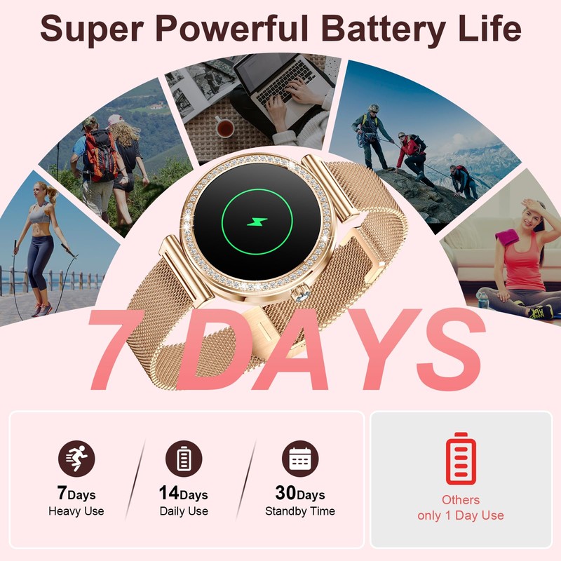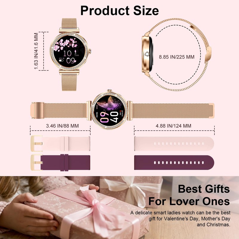 - 1.27inch Diamond Dial &3 Watch bands】2025 newest women smartwatch is equipped with a stunning 1.27-inch TFT high-definition touch screen that offers vivid and colorful image display,resolution 360*360, providing better visual effects and a silky smooth operating touch. At the same time, the ladies' smartwatch come with 3 watch bands,1xStainless Steel Rose gold Strap,1xpink Soft silicone strap,1xburgundy Soft silicone strap,wearing different watch band for your wearing style.